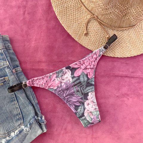 Bombacha de bikini modelo colaless, de lycra estampada. con breteles elastizados, con pasantes regulables inoxidables. Resistente al cloro, y mar.